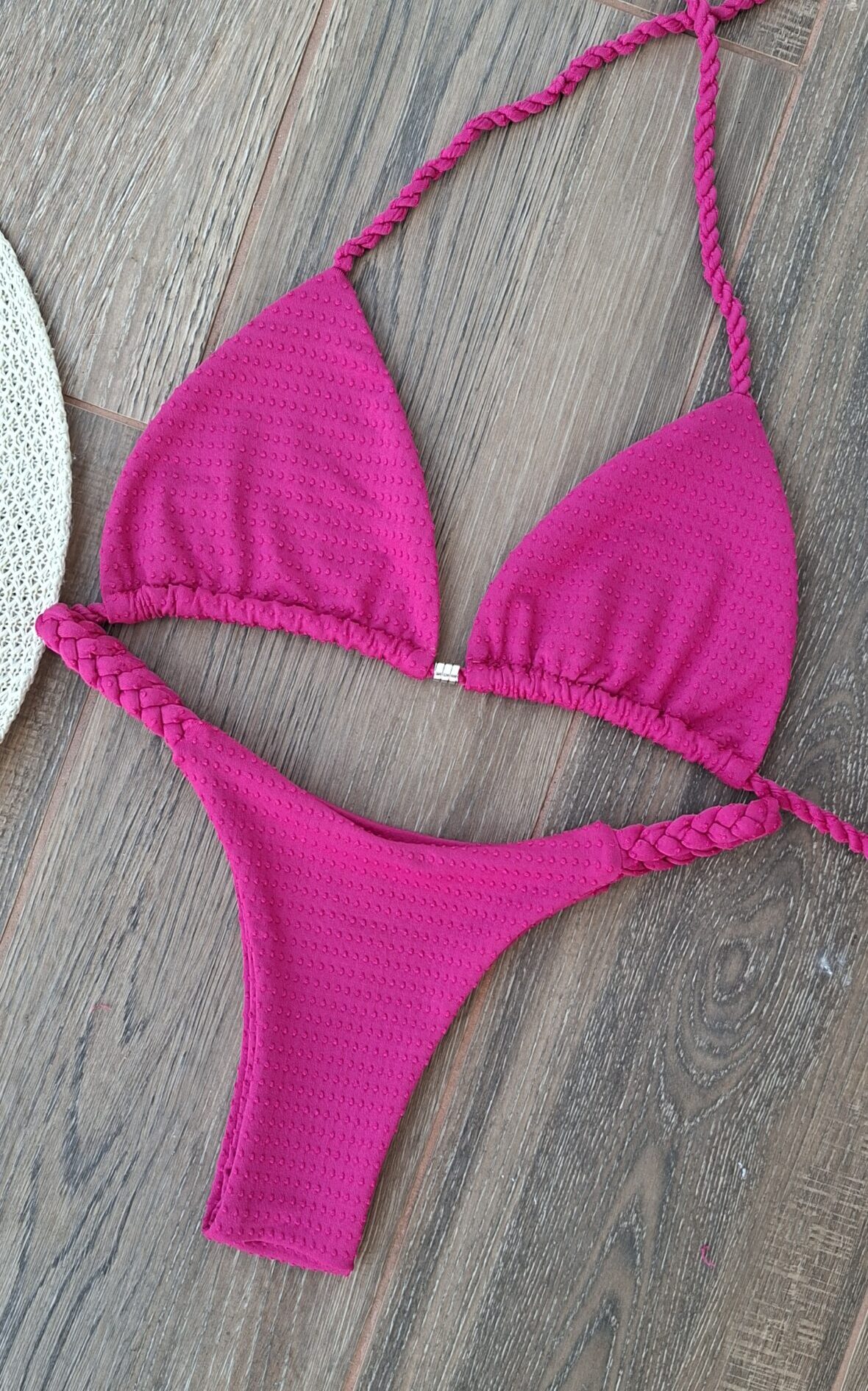 Conjunto composto por cortininha Ágata, que possui viés (tecido sobreposto) em toda lateral. Essa costura impossibilita que a parte interna do busto (forro) apareça. As alças possuem elástico embutido. Possui bojo removível. Calcinha modelo fio duplo asa delta. Cós mais alto que a tradicional, se encaixa na categoria de cós médio. Parte frontal possui viés (costura sobreposta na borda). Atrás, tamanho meio fio (acompanha tamanho da frente)